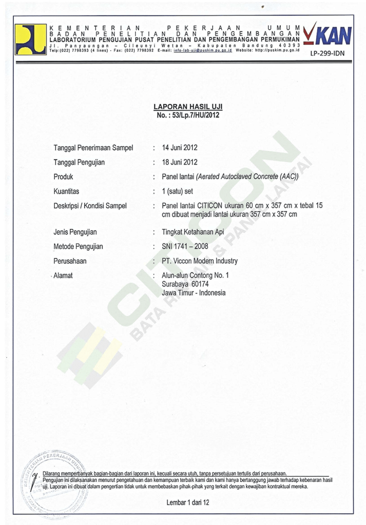 - Sertifikat dan Tes Uji Panel Lantai Citicon